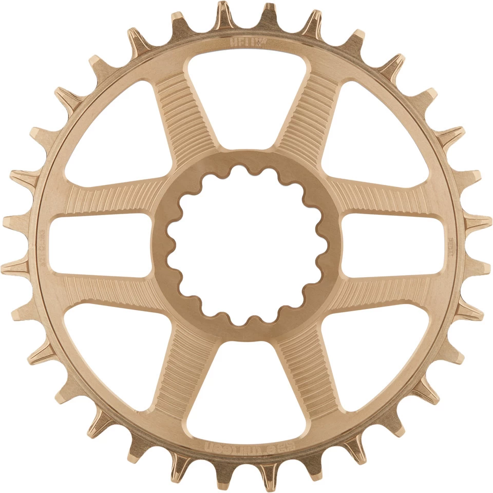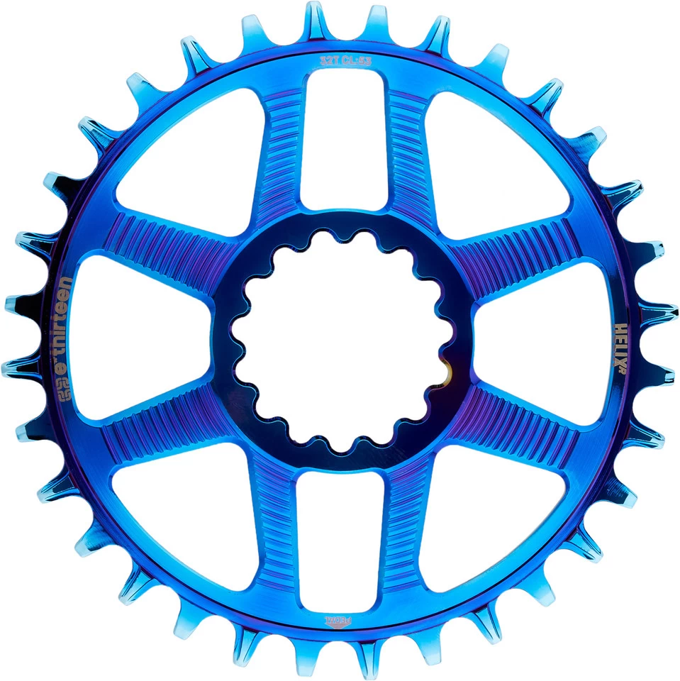 Dieses Helix R Guidering Kettenblatt von e*thirteen wird per Direct Mount an den Helix Kurbeln befestigt und liefert in Kombination mit SRAM oder Shimano Antrieben starke, verlässliche Leistung. Je nachdem, wie herum Du es montierst, bedient es eine Boost- oder eine Super-Boost-Kettenlinie.