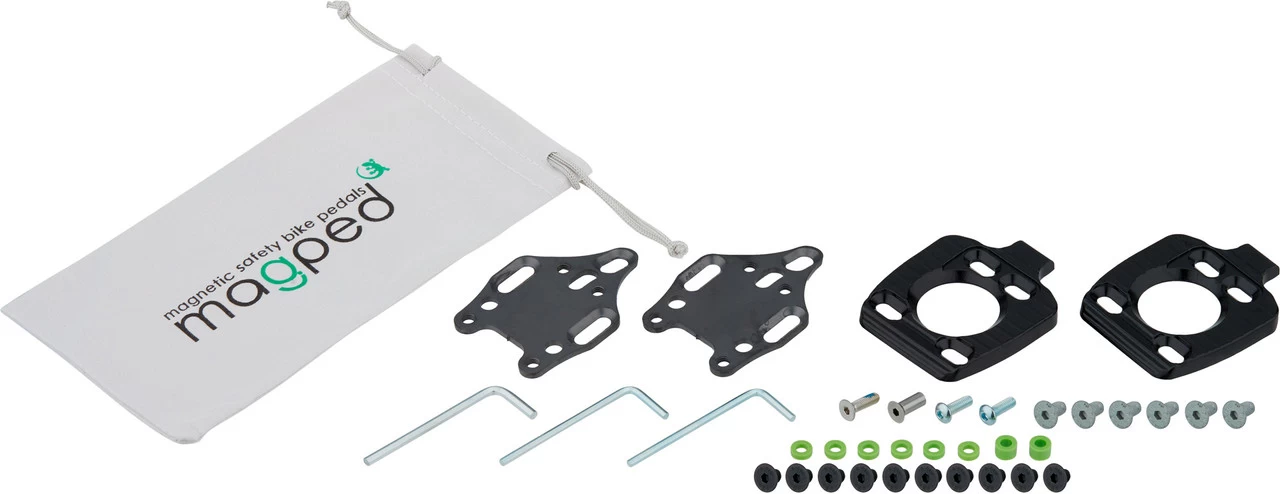 Lieferumfang:1 Paar Pedale magped Road (links und rechts)2 x Magnet magped 200 N1 Paar Schuhplatten magped Road Metall1 Paar Schuhplatten magped Kunststoff10 x Schraube magped zur Schuhplattenbefestigung, schwarz6 x Schraube magped zur Schuhplattenbefestigung, silber6 x Unterlegscheibe magped zur Schuhplattenbefestigung2 x Schraube magped2 x Distanzstück magped3 x Innensechskant magpedDirekt mitbestellen:Neodym-Ersatzmagnete