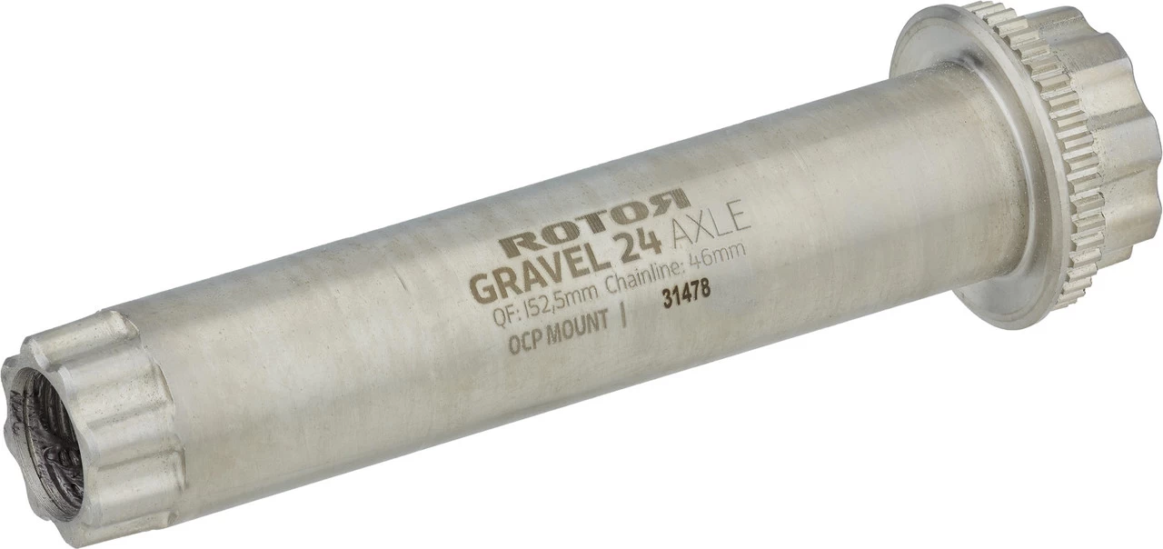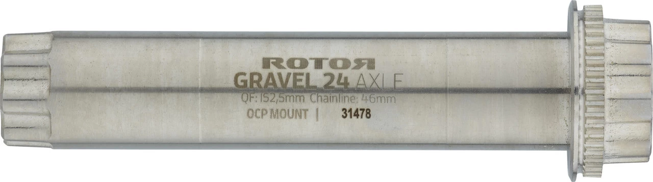Die Rotor Gravel-Kurbelachse für die ALDHU bzw. VEGAST 24 Kurbelarme und Innenlager nach Shimano-Standard eignet sich für Gravelbikes und Rennräder, die eine Kettenlinie von um die 46 mm aufweisen. Das ist etwa bei der Shimano Gravel-Schaltung GRX oder bei SRAM-Wide-Antrieben der Fall. Der von der Gravel-Achse erzeugte Q-Faktor liegt bei 152,5 mm. Die Achse besteht aus Stahl und weist die spezielle OCP-Mount-Verzahnung auf, welche bei Verwendung eines passenden Spiders die Feineinstellung ovaler Kettenblätter in 1-Grad-Schritten erlaubt.