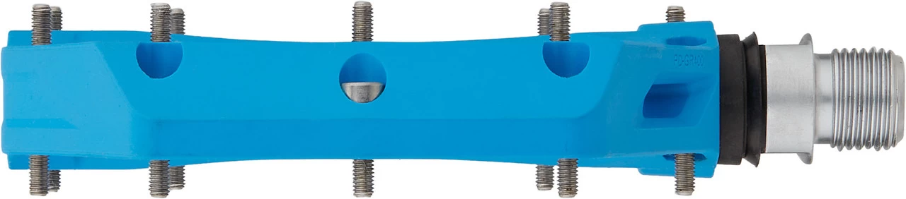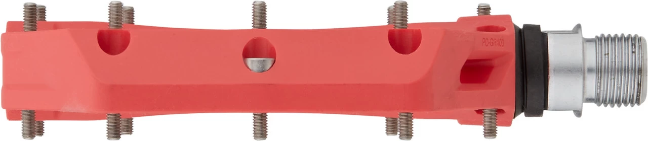 Die PD-GR400 Plattformpedale von Shimano für entspanntes Trail- und All-Mountain-Riding bringen pro Paar etwa 130 Gramm weniger auf die Waage als das Modell PD-GR500. Sie bieten dem Fuß stabilen und sicheren Halt, der durch die neun austauschbaren Pins auf jeder Seite noch verstärkt wird. Der Pedalkörper besteht aus Kunststoff, ist maximal 16 mm dick und hat eine Aufstandsfläche von 101 x 96 mm. Die Achse ist über zwei Buchsen gleitgelagert und abgedichtet. Am besten Du kombinierst das PD-GR400 Pedal mit den GR-Schuhen von Shimano.